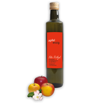 Traditionelle Apfelsorten werden frisch gepresst und vergoren, dieser aromatische Apfelmost wird schonend zu Apfelessig fermentiert, dadurch bleiben alle wertvollen Inhaltsstoffe erhalten.